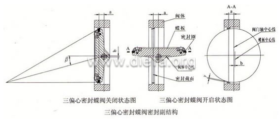 由于在雙偏心蝶閥的基礎上將閥座中心線再與閥體中心線形成一個β角偏置,使得蝶閥在啟閥過程中,蝶板的密封面在開啟瞬間立即脫離閥座密封面,而在關閉瞬間才會接觸并壓緊閥座密封面。當完全開啟時,兩密封面之間形成一個與雙偏心密封蝶閥相同的間隙y,該類蝶閥的設計,徹底消除了兩密封面之間的機械磨損和擦傷,使蝶閥的密封性能和使用壽命都得到大大提高。