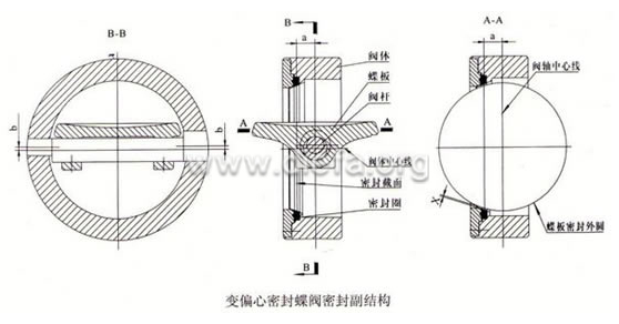 變偏心蝶閥的獨特之處在于安裝蝶板的閥桿軸是一個三段軸式結構,此三段軸式閥桿兩段軸段同心,而中心段軸中心線與兩端軸線偏離一個中心距,蝶板就安裝在中間軸段上。這樣的偏心結構使得蝶板在全開位置時成為雙偏心狀,而在蝶板轉動到關閉位置時則成為單偏心狀。由于偏心軸的作用,在接近關閉時,蝶板向閥座的密封錐面內移進一個距離,蝶板與閥座的密封的密封面相吻合達到可靠的密封性能。