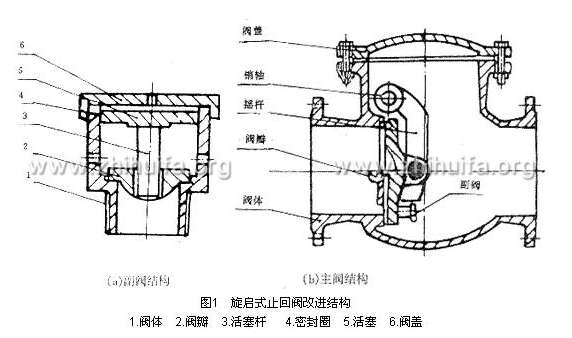 在原旋啟式止回閥閥瓣上增設(shè)緩閉副閥(圖1)。副閥安裝在主閥閥瓣下側(cè)或兩側(cè)且用螺紋聯(lián)接,介質(zhì)正常流動閥門開啟時,介質(zhì)壓力將副 閥打開,介質(zhì)通過副閥小孔流入主閥出口端,使主閥進水口端卸壓,主閥閥瓣開啟,主閥前后壓力趨于平衡;介質(zhì)逆流時,主閥閥瓣在逆流介質(zhì)作用下快速關(guān)閉,而副閥閥體上部為緩沖缸,副閥閥蓋旋入閥體上部其蓋上有一小孔,副閥閥瓣與其活塞桿空套有一定間隙,活塞與緩沖缸之間采用O型橡膠圈密封,活塞下部與閥瓣之間為平面密封;當(dāng)副閥閥瓣隨主閥閥瓣關(guān)閉而關(guān)閉時,因副閥閥蓋小孔的作用,介質(zhì)通過小孔逐漸流入副閥緩沖缸上腔體,一部分介質(zhì)通過副閥閥瓣與活塞桿之間的間隙倒流,故副閥活塞是緩慢關(guān)閉的。該結(jié)構(gòu)主閥的關(guān)閉相當(dāng)于快關(guān)階段,副閥的 緩慢關(guān)閉相當(dāng)于慢關(guān)階段,依據(jù)泵站機組水力和機械過渡機理說明該結(jié)構(gòu)設(shè)計能有 效地防止水錘升壓。