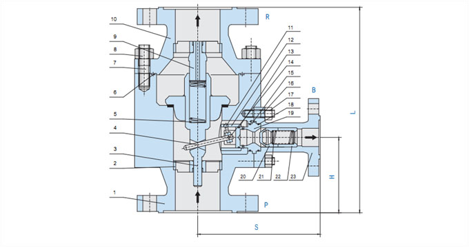 根據感應到的主路流量不同,自動再循環閥的主閥瓣止回錐將自動移動到某一個位置上。同時主閥瓣帶動旁路閥杠桿,將主閥瓣動作傳遞至旁路,通過杠桿控制旁路閥閥瓣的位置,改變旁路的節流面積,從而控制通過旁路的流量。當主閥瓣回至閥座關閉狀態時,所有流量通過旁路回流。當主閥瓣上升至頂端位置時,旁路則完全關閉,所有泵的流量流向工藝系統。該閥集四種功能于一體。